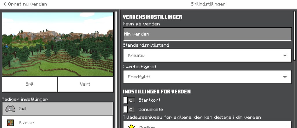 Uanset om grupper er oprettet af dig eller eleverne, skal I lave nogle aftaler omkring indstillinger i verdenen. Fx hvem der er host, og hvilken rolle man har som spiller. Hvis indstillinger er svære at overskue, så kan eleverne være gode hjælpere i forhold til en uddybning af de forskellige områder. Afhængig af opgavetype, skal man forholde sig til, om verdenen skal være uendelig eller flad, og der er forhold omkring dag og nat og vejr, som også kan indstilles. Det er også muligt at vælge mellem kreativ eller overlevelse, hvor kreativ nok oftest er at foretrække i undervisningssammenhæng. I skal også vælge, om der må være væsener, og der også indstillinger for, om der kan ødelægges ting og om man kan skade hinanden. Her skal du være opmærksom på jeres fælles regler i klassen. Hvis du selv er vært for en verden, kan du altid ændre på indstillinger ved behov.